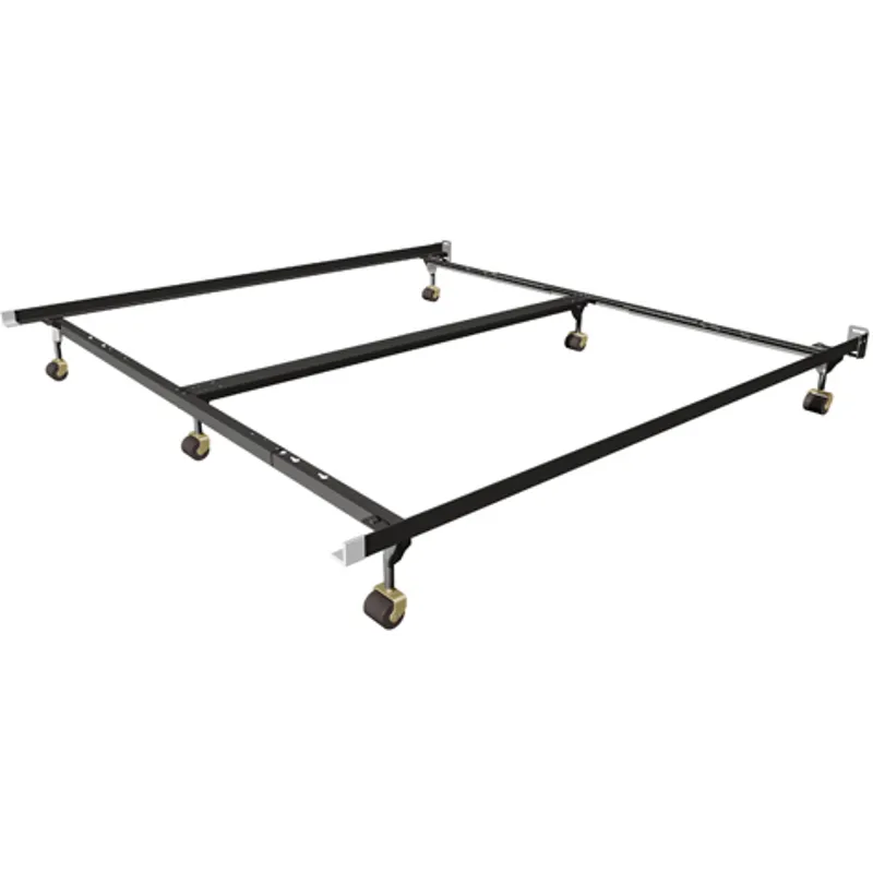 Queen/King Standard Insta-Lock Bed Frame 1 1/4" side rail, 70" long sides, single center rail, 6 legs with 4 nylon rug rollers, 2 plastic glides Constructed from recycled railroad steel, the Mantua Insta-lock Series is strong and durable. The Insta-Lock design makes adjusting the frame easy, providing the box spring with a secure and stable fit. Because no tools are needed for assembly, setup is quick and easy. Made in the USA. Instruction Manual