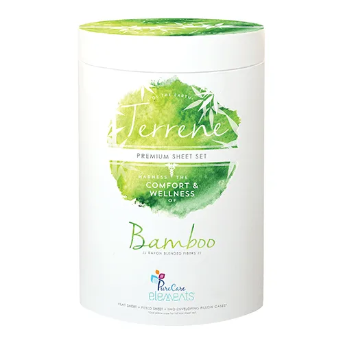 Harness the gentle and rich comfort of Terrene sheets featuring a soft, sateen woven blend of premium long staple cotton and lush bamboo rayon fibers. PureCare Elements sheets are designed with comfort and construction features that provide an ideal fit for both standard and adjustable base mattresses up to 18" deep.