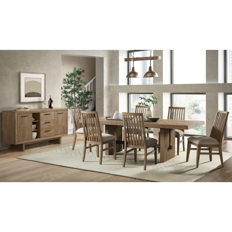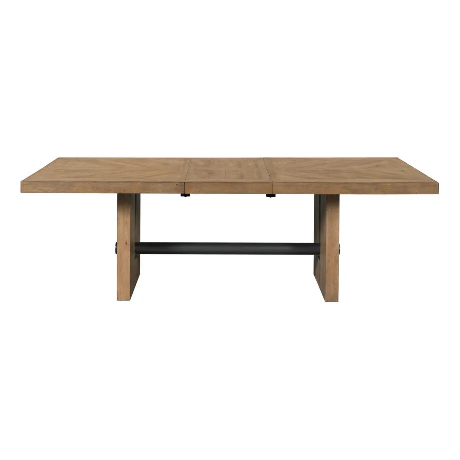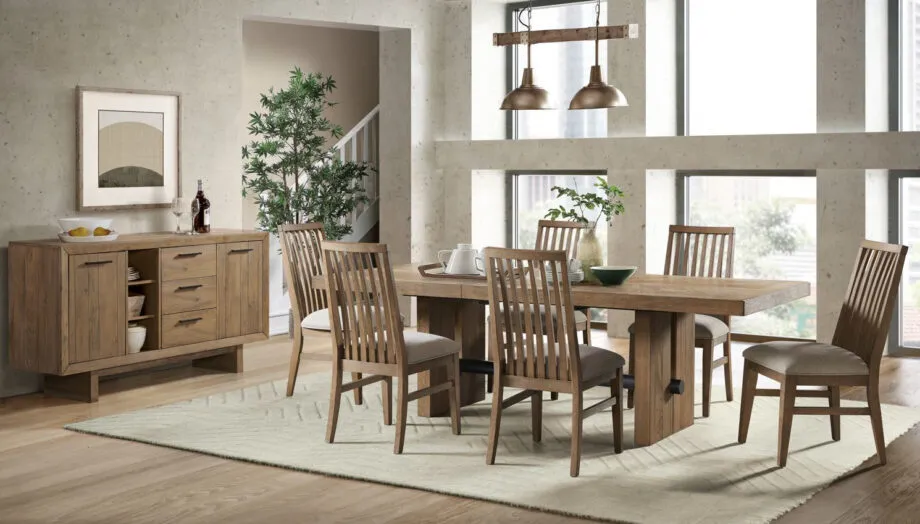 The Landmark Dining Collection has beautifully veneered table tops that feature a very unique sunburst pattern. The light saw mark accents and weathered oak finish gives this sleek modern collection a classic rustic feel. Mix and match this collection with the various chairs and bench seating options to best fit into your daily life.