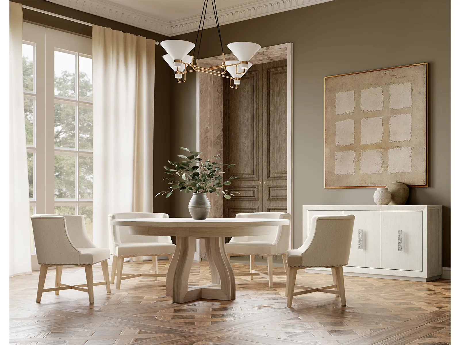 Organic and rustic and and modern are all adjectives used to describe the pieces in this distinctive dining room collection. Chunky slab like tabletops are supported by unique modern farmhouse inspired bases. Both tables can be expanded to generous sizes accommodating almost any sized gathering. The portfolio includes three dining chairs options designed to fit a broad array of style preferences. A modern and upholstered ladderback chair feels comfortable in a relaxed everyday setting. A softly curved hybrid host chair is great for a more transitional aesthetic and a low profile and fully upholstered club chair makes a great choice for an easy and laid-back vibe. Each chair is upholstered in a textured neutral fabric. The statement buffet and with its beveled and mitered corners and statement hardware has plenty of storage capabilities for your everyday needs.