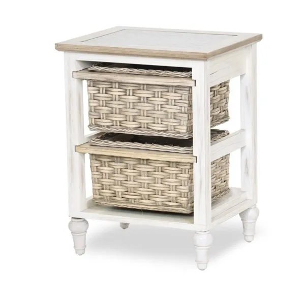 - The Sea Breeze woven 2-basket storage cabinet is stocked and shown in Weathered Wood/White finish