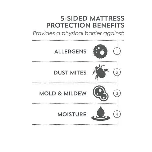 Designed to fit like a fitted sheet around your mattress, our blended OmniGuard® Advance and Celliant fiber 5-Sided protectors are breathable, quiet, completely washable on hot settings and provide a physical barrier against allergens, dust mites, stains, moisture, mold and mildew. Designed to promote a temporary increase in blood flow†, clinically tested Celliant fibers promote increased performance, faster recovery time from physical activity and help to promote restful sleep. Trim: 8" - 13.5" deep Twin: 39" x 75" Twin XL: 39" x 80" Full: 54" x 75" Full XL: 54" x 80" Queen: 60" x 80" King: 76" x 80" Cal. King: 72" x 84" Standard: 14" - 18" deep Twin: 39" x 75" Twin XL: 39" x 80" Full: 54" x 75" Full XL: 54" x 80" Queen: 60" x 80" King: 76" x 80" Cal. King: 72" x 84"