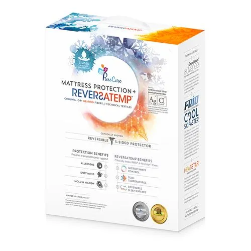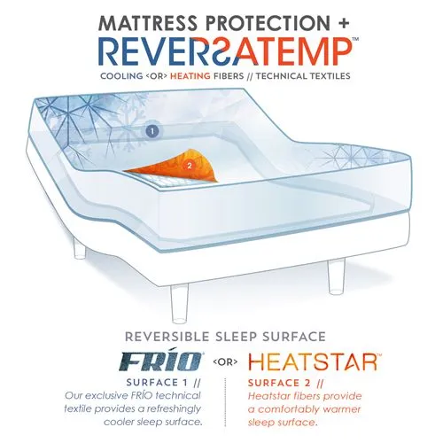 Comfort & Construction: The ReversaTemp™ 5-Sided mattress protector's double-sided construction provides a customizable solution for temperature control while protecting the top and sides of your mattress. Unique construction features provide an ideal fit for both standard and adjustable base mattresses up to 18" deep. Featured technical textiles: FRÍO rapid chill cooling fibers Heatstar insulating fibers Twin XL Queen King Cal King Split Cal King