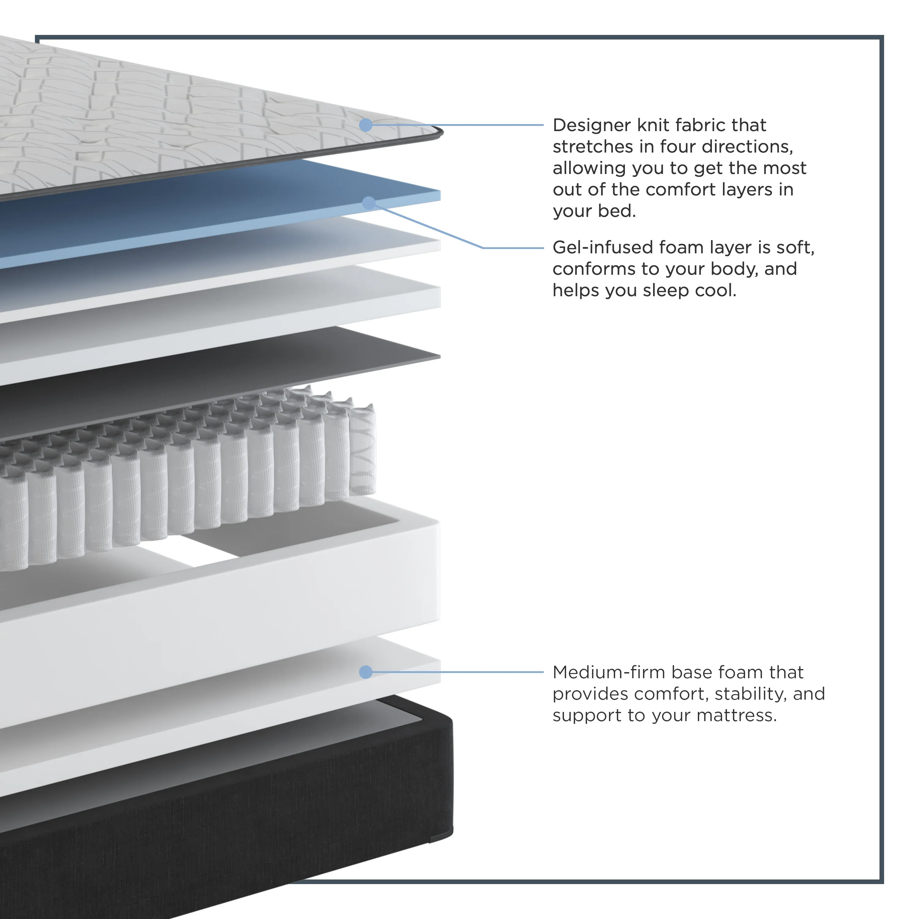 The Encore® Signature Normandy Soft Tight Top Mattress combines layers of cooling gel, medium-firm upholstery, and fabric-encased coils all within designer knit fabric for advanced support and comfort, night after night.